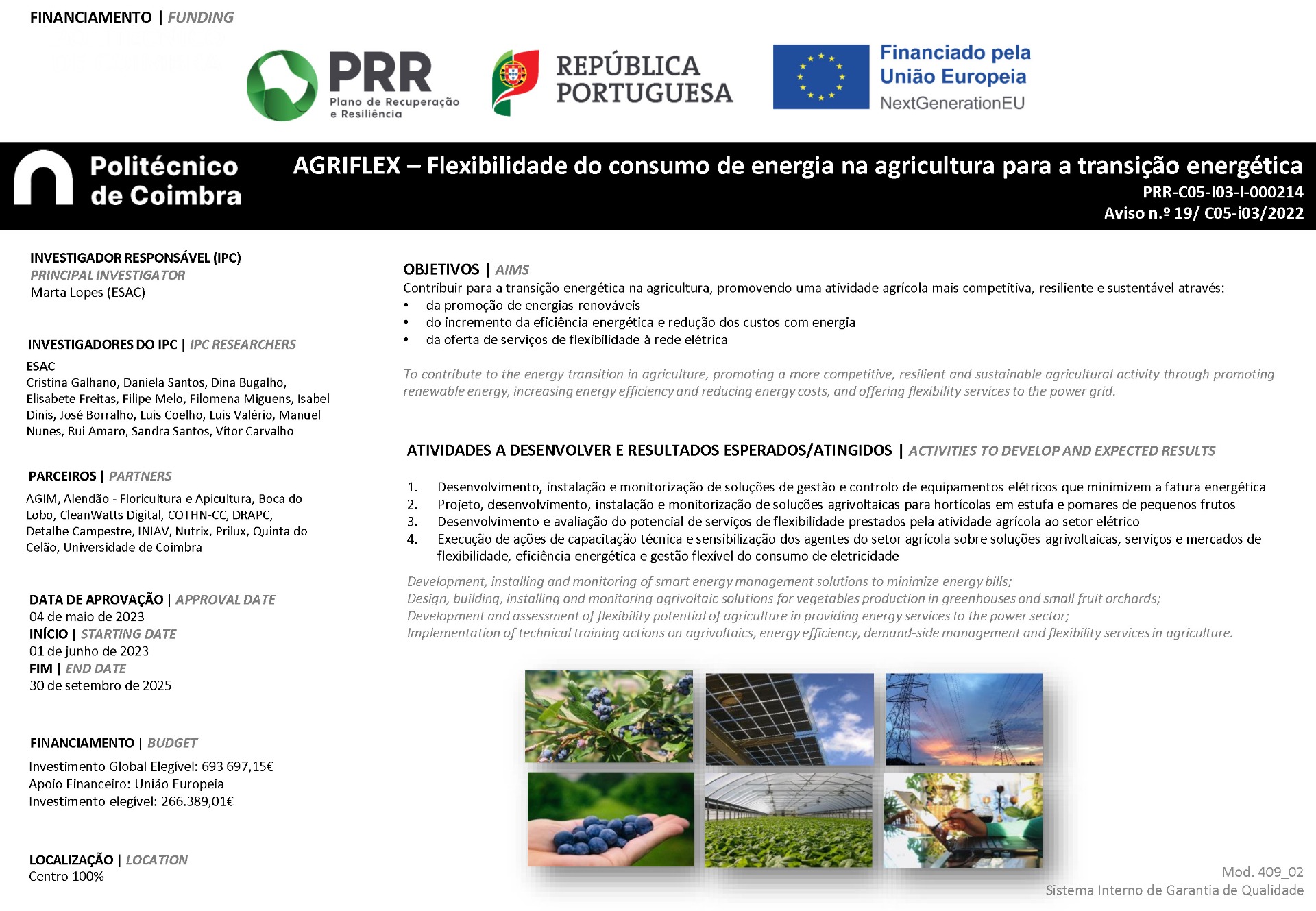 - o desenvolvimento e instalação de soluções agrovoltaicas para produção de hortícolas em estufa e pomares de pequenos frutos;