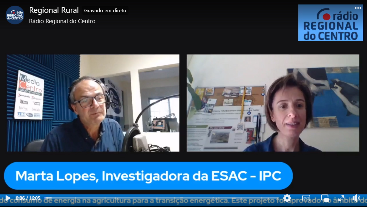 Entrevista à Rádio Regional Rural em julho de 2023 - AgriFLEX - Flexibilidade do consumo de energia na agricultura para a transição energética, assim se denomina o projeto liderado pela Escola Superior Agrária do Politécnico de Coimbra (ESAC-IPC), recentemente aprovado no âmbito do PRR (Plano de Recuperação e Resiliência). Dr.ª Marta Lopes, investigadora da ESAC - IPC e responsável pelo projeto explica o que motivou a avançar. Clique para assistir.